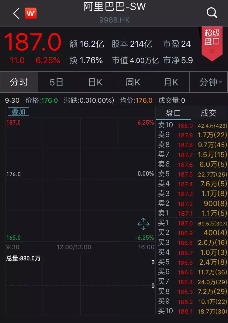 11月26日9点30分,阿里巴巴集团在香港交易所鸣锣上市,开盘价187港元,较发行价大涨6.25%,阿里巴巴集团成为首个同时在美股和港股两地上市的中国互联网公司。