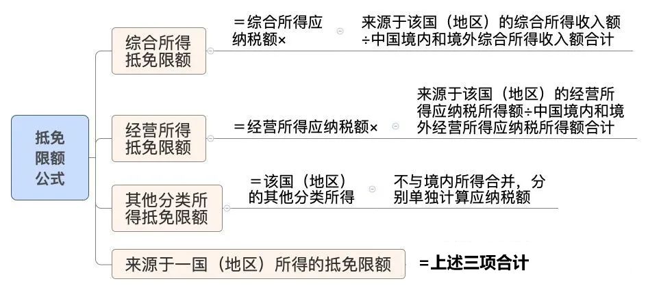 居民个人来源于一国(地区)的综合所得、经营所得以及其他分类所得项目的应纳税额为其抵免限额,按照下列公式计算: