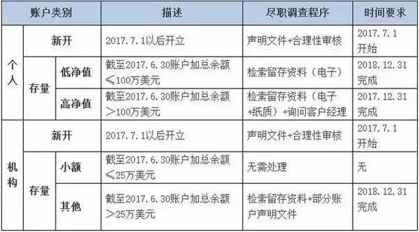 2018年12月31日前,完成对其余存量个人低净值账户和所有存量客户的尽职调查程序,识别其中的非居民账户。