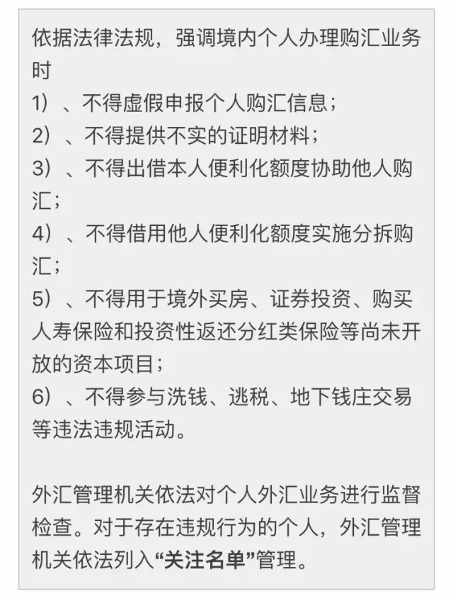 新政以前一次可以多可以汇五万美元,新政实施后每次只能汇一万美元。频繁汇款可能会被怀疑成"蚂蚁搬家"列入关注名单,取消5万汇购额度2年。