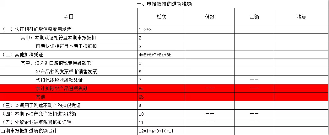 新增8a"加计扣除农产品进项税额"栏,填写纳税人将购进的农产品用于生产销售或委托受托加工17%税率时,为维持原农产品扣除力度不变加计扣除的农产品进项税额。该栏不填写"份数""金额",执行农产品增值税进项税额核定扣除办法的农产品进项税额不填列在该栏。