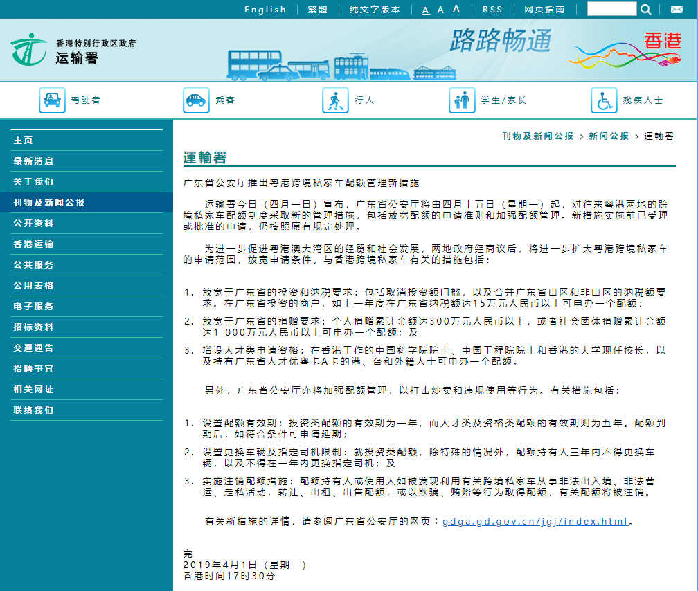 香港运输署正式4月1日宣布,广东省公安厅4月15日起,对往来粤港两地的跨境私家车配额制度采取新的管理措施,包括放宽配额的申请准则和加强配额管理。(新措施实施前已受理或批准的申请,仍按照原有规定处理。)
