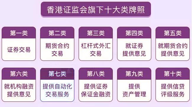 香港市场执行的是金融牌照管理制度,金融机构可以同时申请多类牌照,为境内外各类机构与个人投资者提供特定领域的金融服务。在资管领域,根据香港《证券及期货条例》,目前共有10类受规管活动需要向香港证券及期货事务监察委员会(SFC,简称"香港证监会")申请牌照,具体如下: