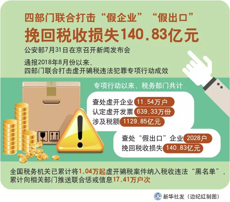 7月31日,公安部在京召开新闻发布会,通报2018年8月份以来,四部门联合打击虚开骗税违法犯罪专项行动成效。专项行动以来,税务部门共计查处虚开企业11.54万户,认定虚开发票639.33万份,涉及税额1129.85亿元;查处“假出口”企业2028户,挽回税收损失140.83亿元。