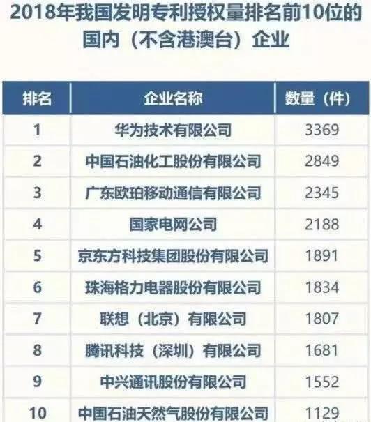 从国内企业排名来看,华为以3369的专利数排名第一。