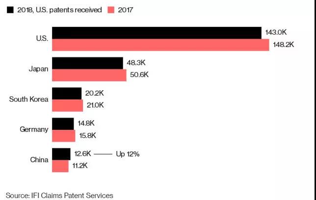 从全球国家总体来看,美国专利局商标局去年授予的专利数量下降了3.5%,除中国外,其他主要国家获得的专利数量都低于上年。在2018美国专利排行榜中,中国专利数量增一成,排全球第五。