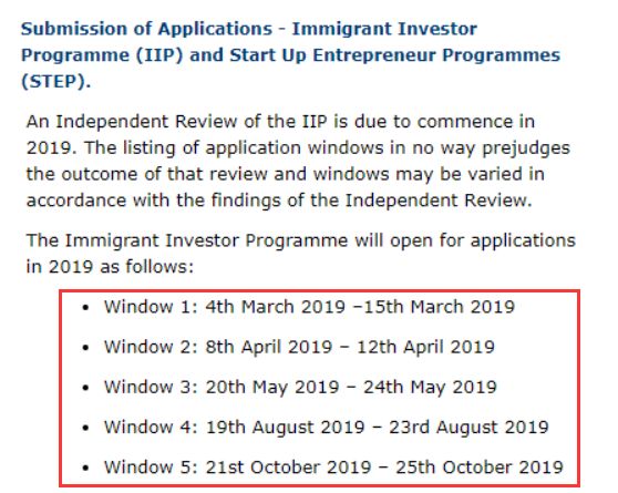 爱尔兰投资移民计划(The Immigrant Investor Programme, IIP)自2012年开放,主要面向想要投资移民爱尔兰的非欧盟国家公民。投资移民投资移民的最低投资额为100万欧元,最短投资期为3年,家庭净资产需达到最低200万欧元 。爱尔兰移民局也公布了2019年的申请窗口,具体如下: