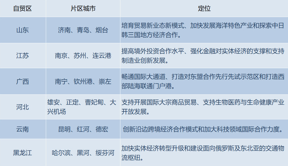 8月26日,国务院印发《中国(山东)、(江苏)、(广西)、(河北)、(云南)、(黑龙江)自由贸易试验区总体方案》。8月30日,6个新设自贸试验区正式挂牌成立。随着山东、江苏、河北新设自贸区,我国沿海省份自贸区实现全覆盖;而广西、云南、黑龙江新设自贸区,则让自贸区在沿边地区首次落地生根。